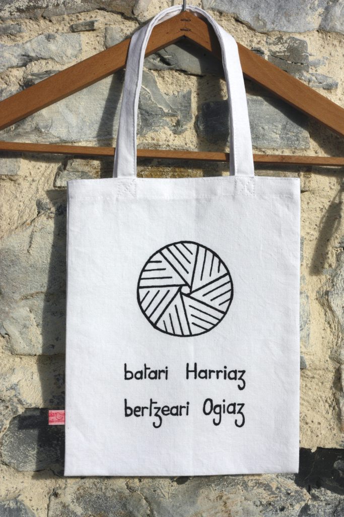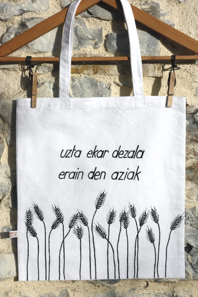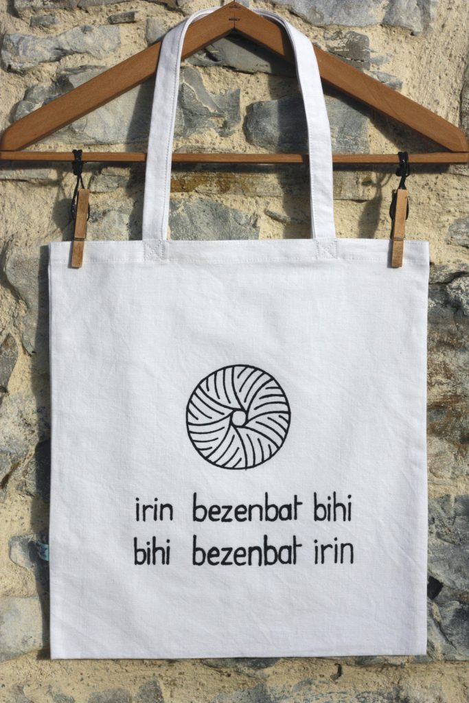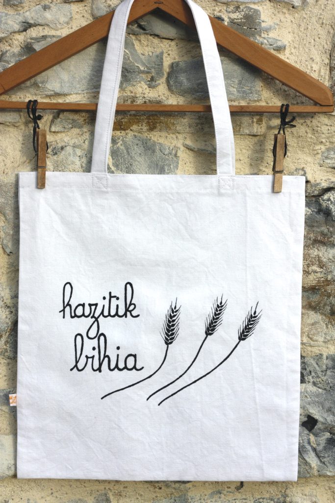 Zakuak diseinaturik eta eskuz eginak dira atelierran. Kotoiezko oihalak berriz biltzen eta erabiltzen ditugu.